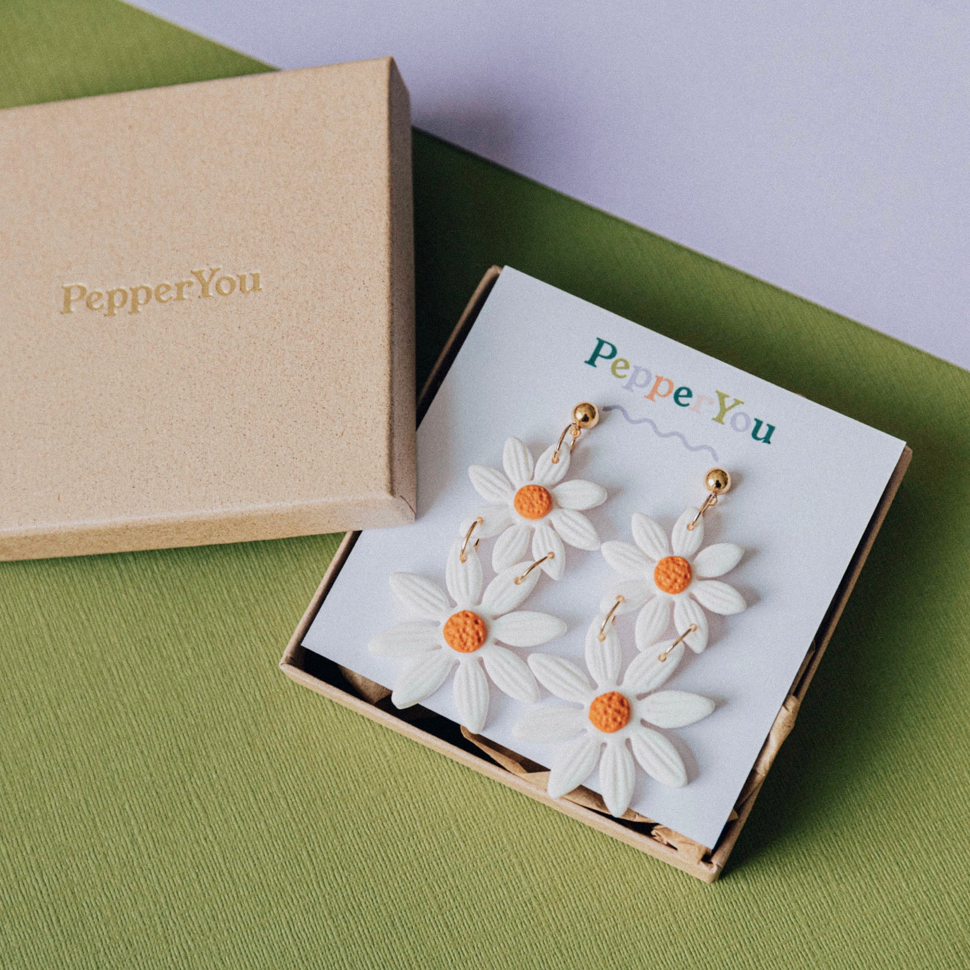 We believe in thoughtful packaging - these earrings are presented in a Pepper You gold branded eco recyclable gift box. It's the perfect finishing touch for a delightful unboxing experience.