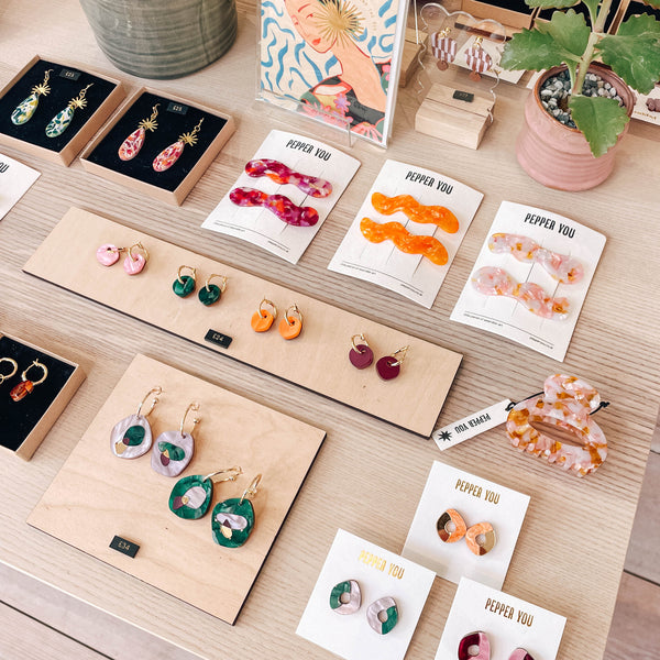 Here you can find a selection of our hand crafted jewellery and Hair Accessories. We also stock goods made by other small businesses and artists.
