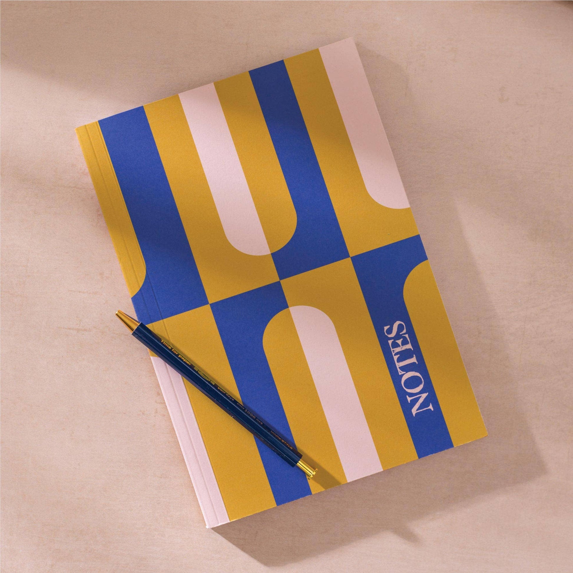 Trending Chartreuse and Deep Blue colours in a geometric design notebook.