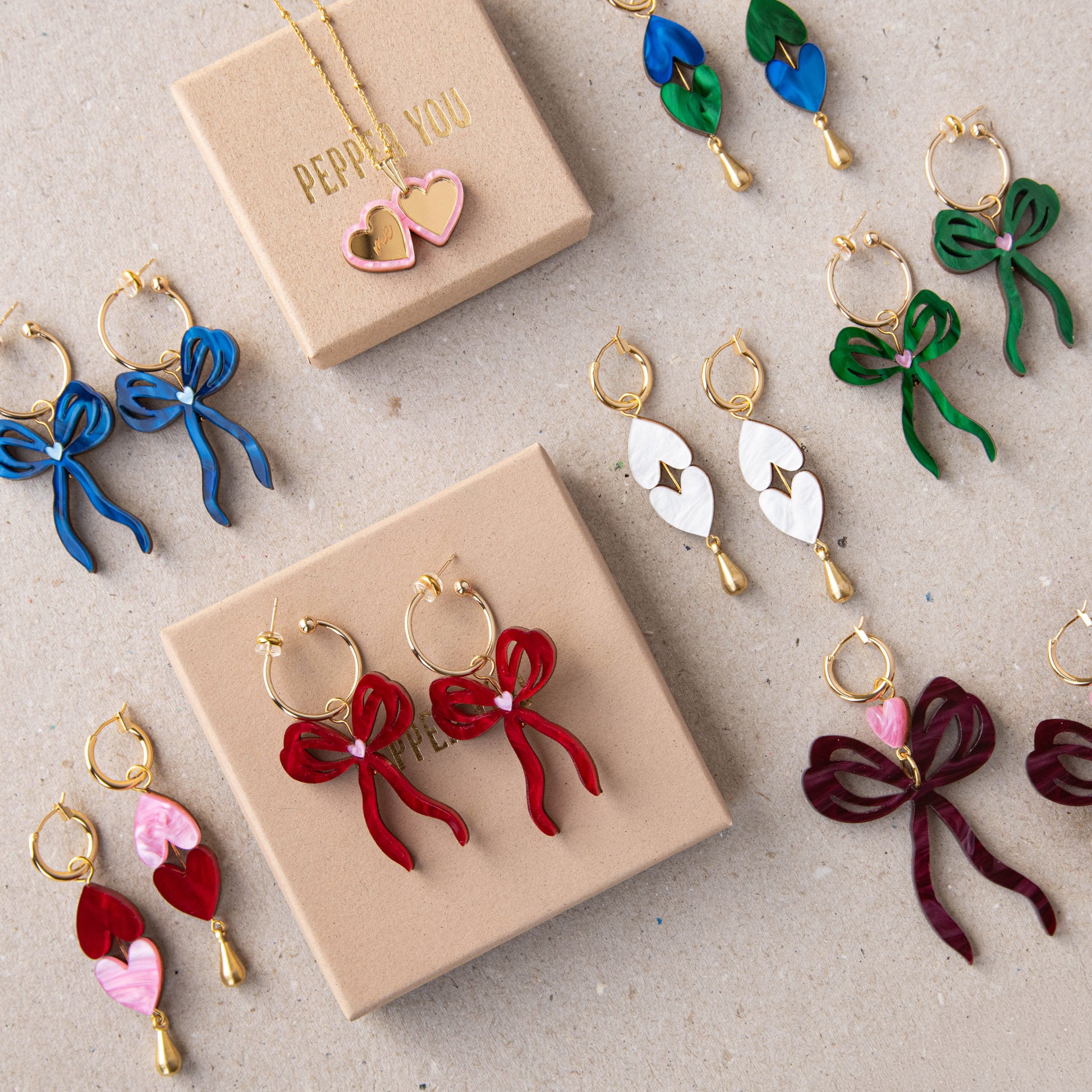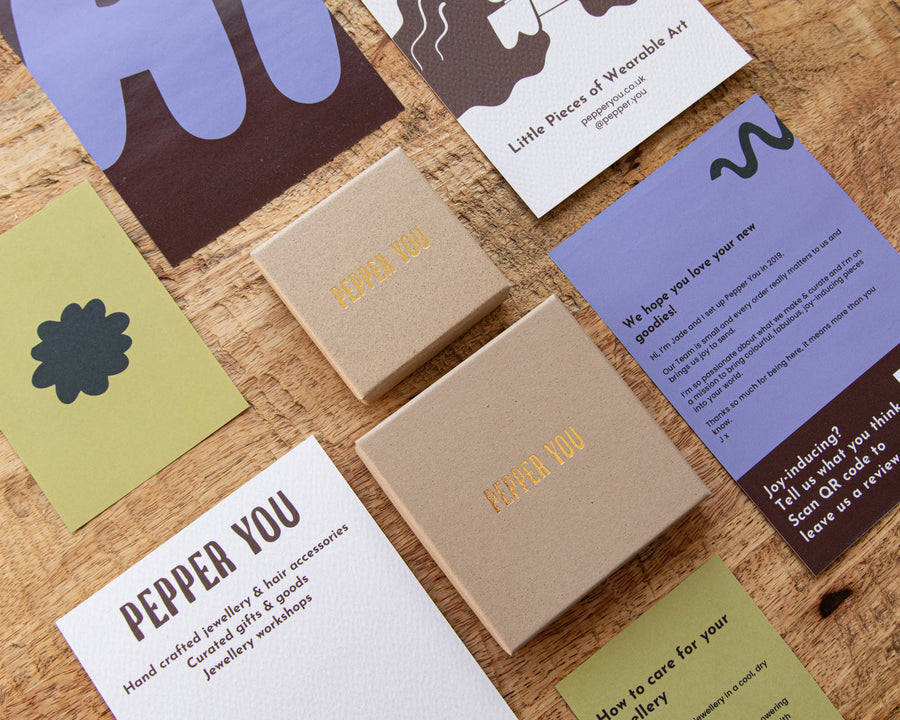 All Pepper You jewellery will arrive with you beautifully presented. Studs arrive on gold branded cards and all other jewellery comes in our signature gold-branded gift boxes.