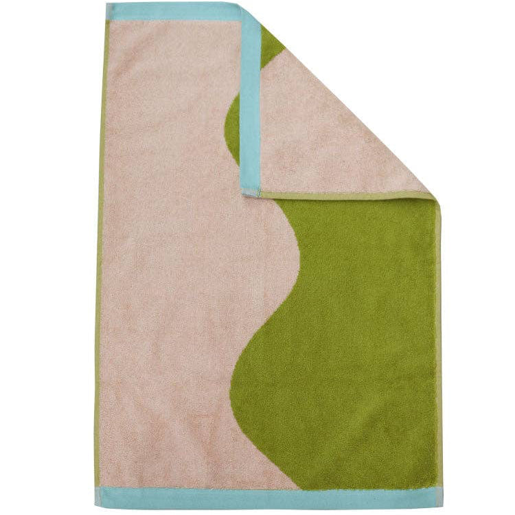 Introducing Mosey Me's Carousel Hand Towel. Inspired by European vintage theme parks, this towel features an abstract design in pistachio and almond with a contract aqua trim. These ultra-plush hand towels are made from 100% organic cotton for high absorbency and a luxurious hand feel.