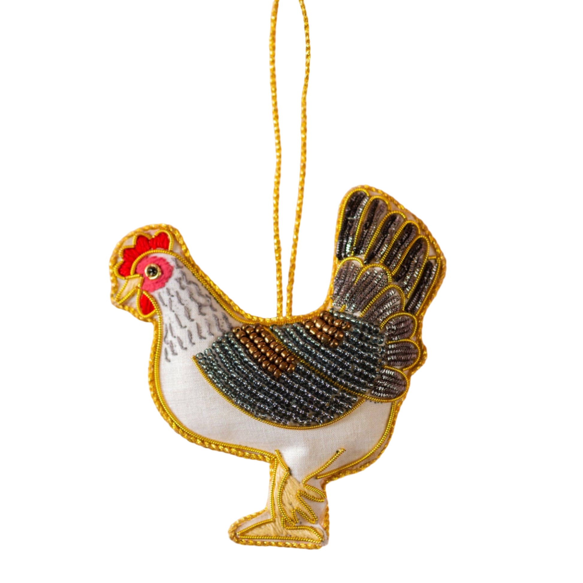 Inspired by our immediate environment at Ian Snow, our smallholding collection is just some of the glorious animals that we meet everyday. This chicken decoration has been made in India using cotton fabric and is filled with recycled plastic. Every detail of this piece has been thought about, from the decoration to the filling, and is completely virgin plastic free. Decorated with glass beads and thread and metal embroidery, this piece is a perfect addition to your festive tree decoration.