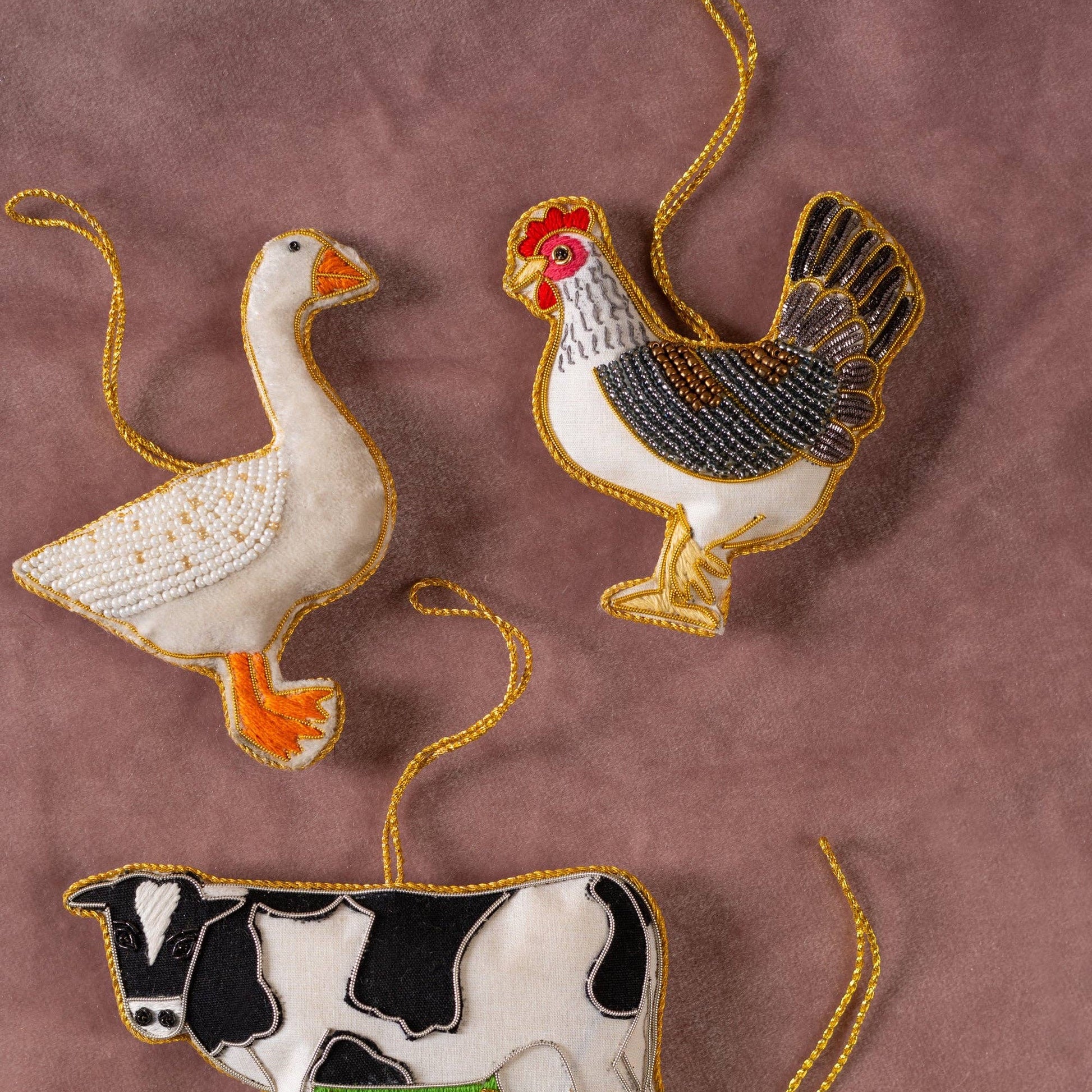 Inspired by our immediate environment at Ian Snow, our smallholding collection is just some of the glorious animals that we meet everyday. This goose decoration has been made in India using cotton fabric and is filled with recycled plastic. Every detail of this piece has been thought about, from the decoration to the filling. Decorated with glass beads and thread and metal embroidery, this piece is a perfect addition to your festive tree decoration.