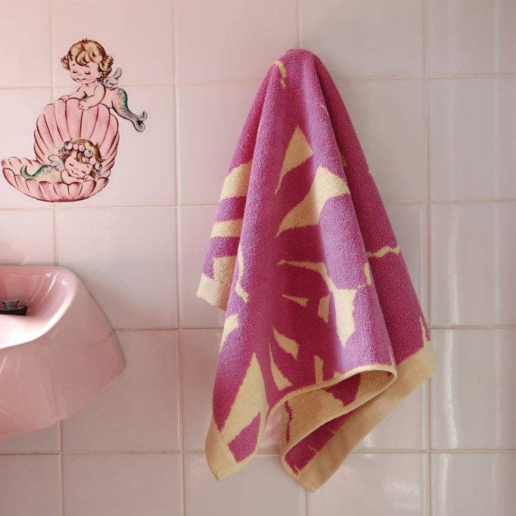 Introducing Mosey Me's Margarita Hand Towel. The abstract floral graphic in orchid and cream creates a striking, feminine design that is perfect for your self-care space. These ultra-plush hand towels are made from 100% organic cotton for high absorbency and a luxurious hand feel.
