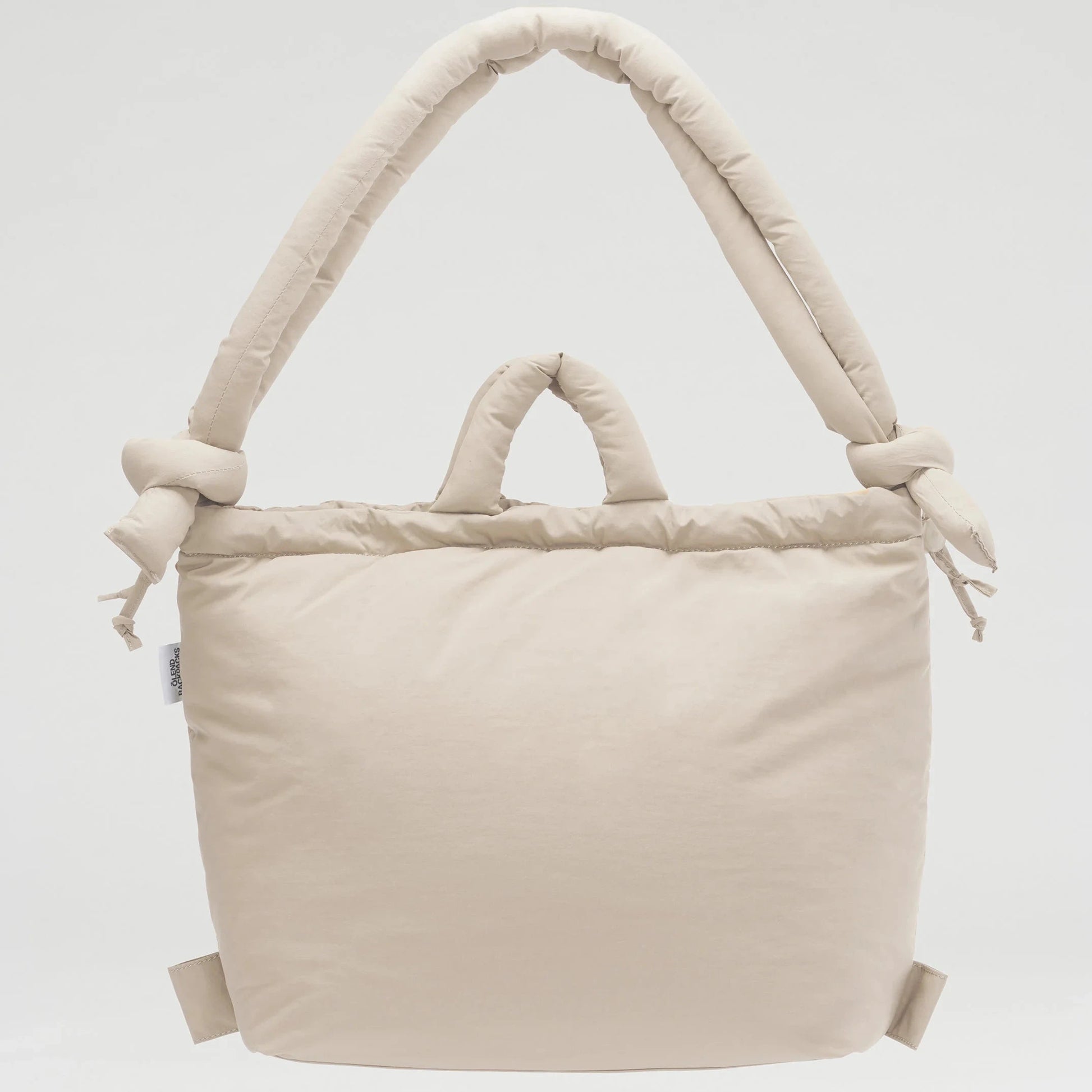 The padded straps can be bound as a shoulder bag or as a backpack, as the occasion requests. Exterior zippered pocket and inner sleeve.