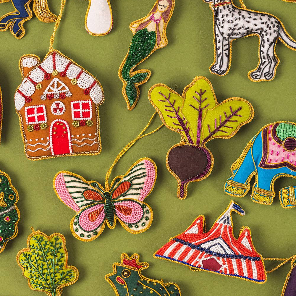 Our pretty butterfly decoration is adorned in soft colours and delicate patterns; celebrate these stunning creatures with this beautiful decoration. This piece has been decorated with intricate metal embroidery and glass beads to create a charming design. Made in India using cotton fabric and filled with recycled plastic, this lovely decoration is perfect for your festive tree, or all year round.