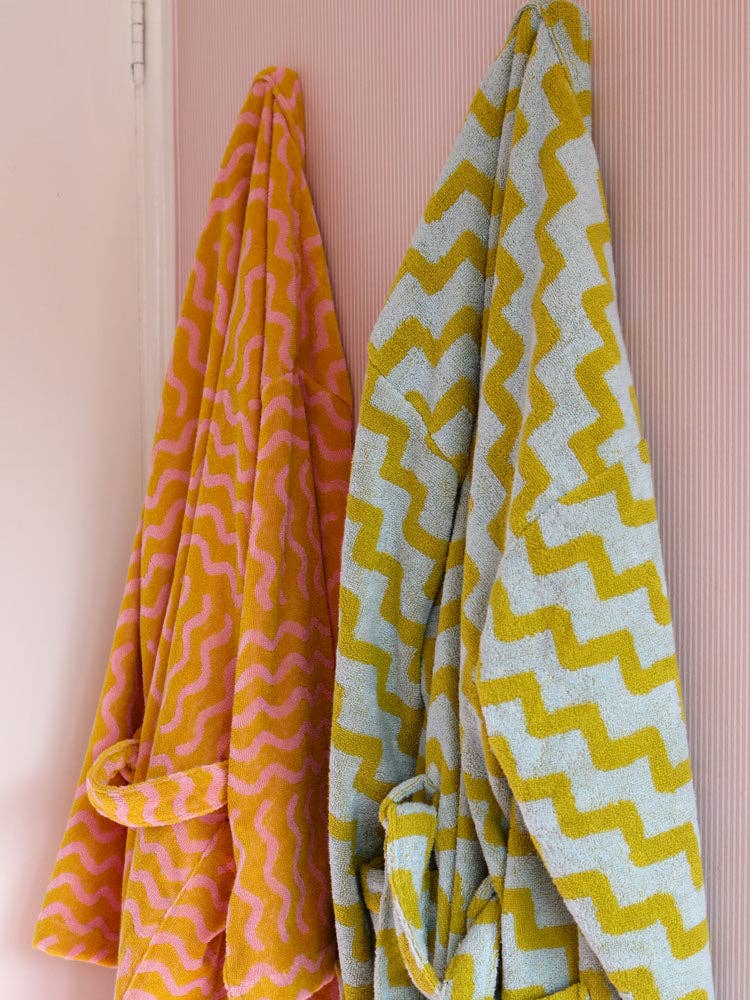 Made in Portugal from 100% organic cotton, it's the perfect self-care staple. This robe is available in two sizes and features a classic, relaxed shape, two pockets, and a tie belt. The absorbent, soft texture and bold design make it both practical and fun, whether as a gift or for yourself.